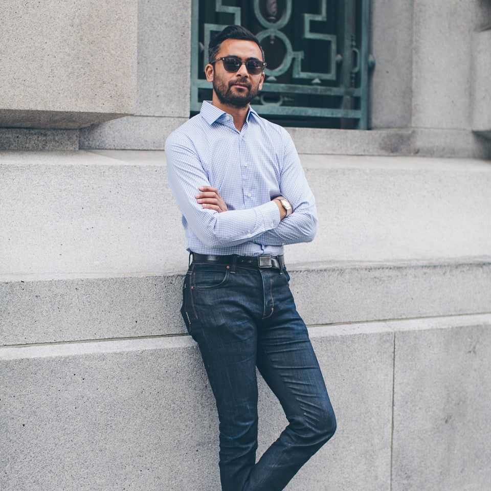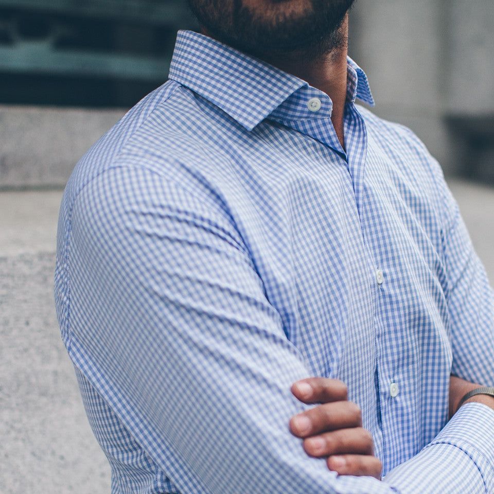 'The devil’s in the details. Meet your new favorite dress shirt in mini sky blue gingham. This shirt has the pieces to get you through any day.'