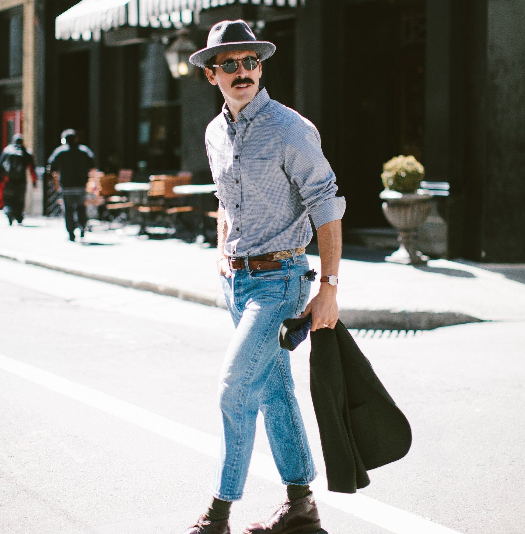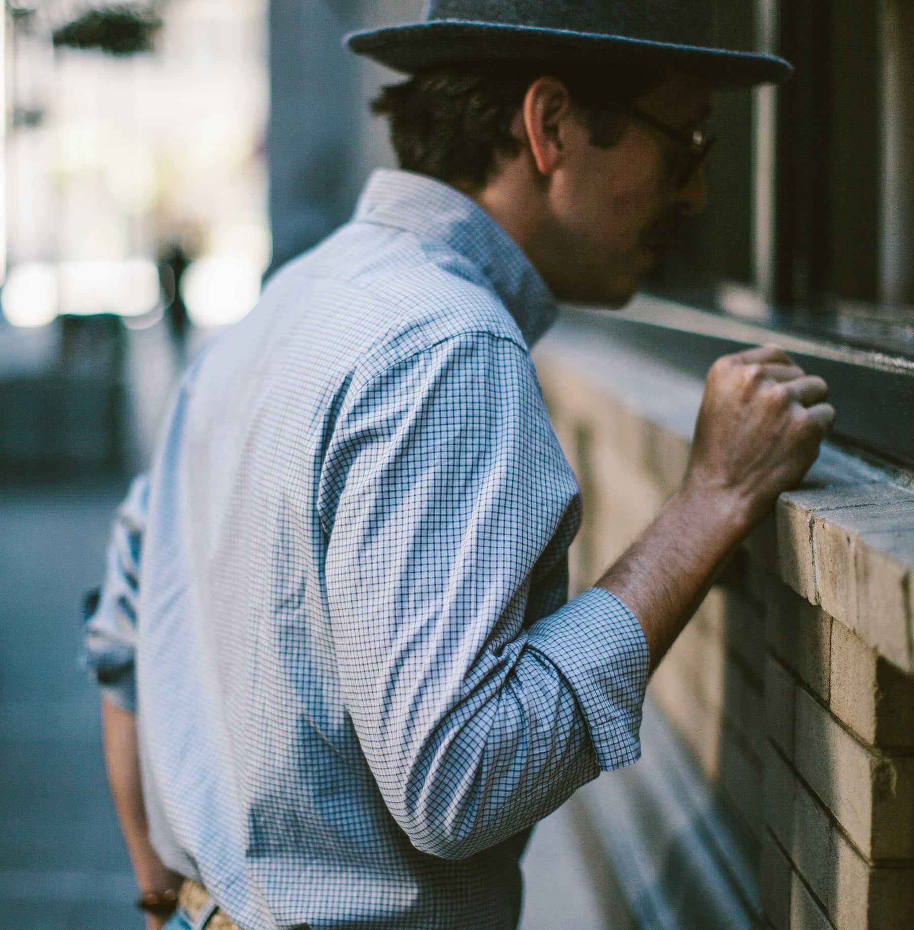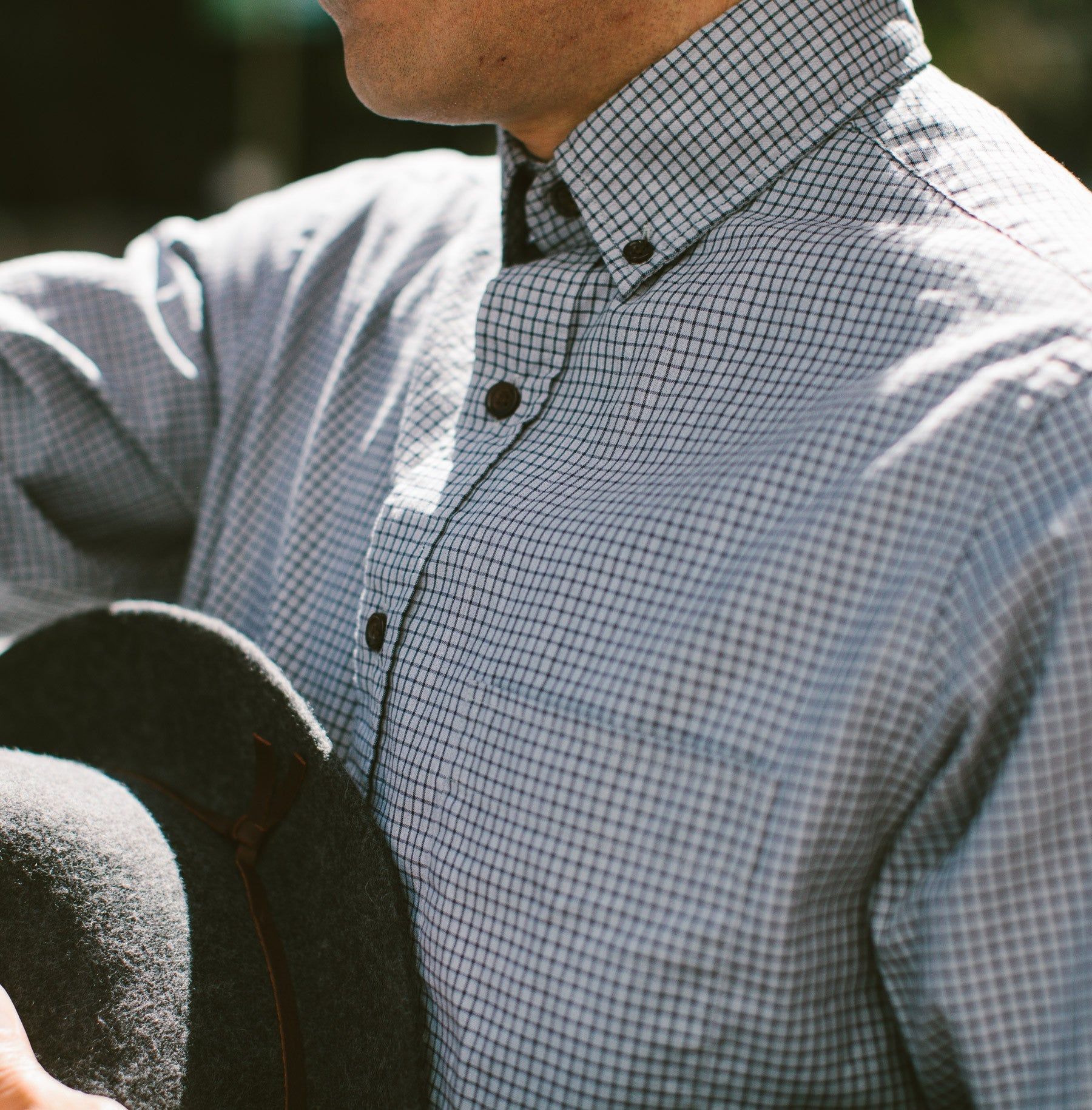 Our staple shirt has a tailored fit with a triple button collar. 7 years in the marking, this oxford comes in a grey and navy box pattern. Shop In-Stock.